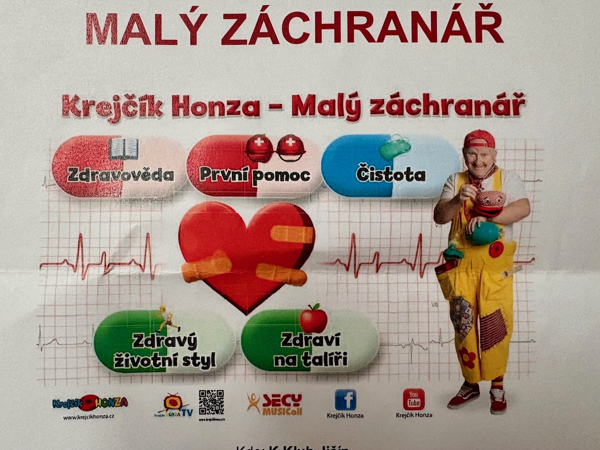V úterý 7.října jsme se zúčastnili divadelního interaktivního představení Malý záchranář v jičínském K-klubu. Nejenom, že jsme se hodně zasmáli Honzovi Krejčíkovi v hlavní roli našeho záchranáře, ale také jsme si s ním pěkné zazpívali. Hlavními tématy vtipného představení byly: první pomoc, zdravotní výchova, prevence předcházení nemocem, hygiena – proč a jak správně dbát na čistotu, zdravá výživa – jak se správně stravovat a proč je to důležité.