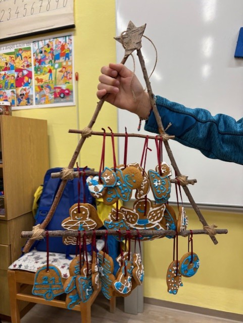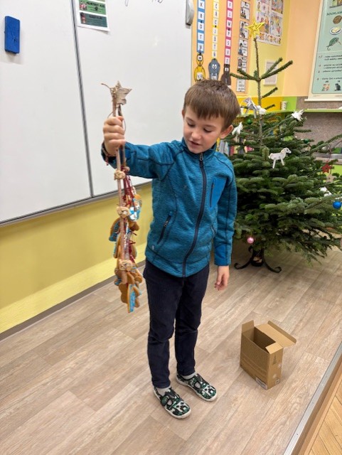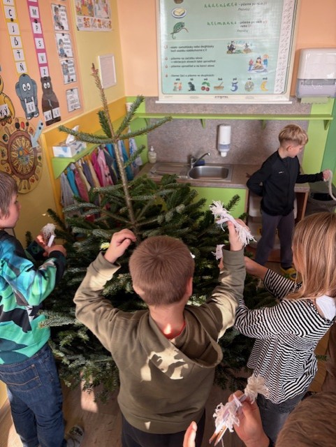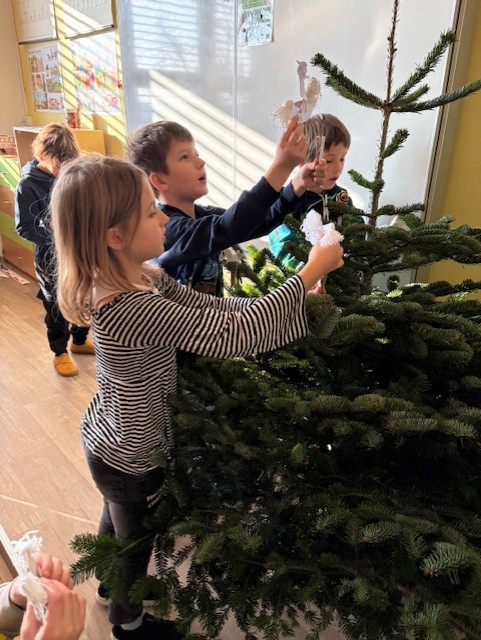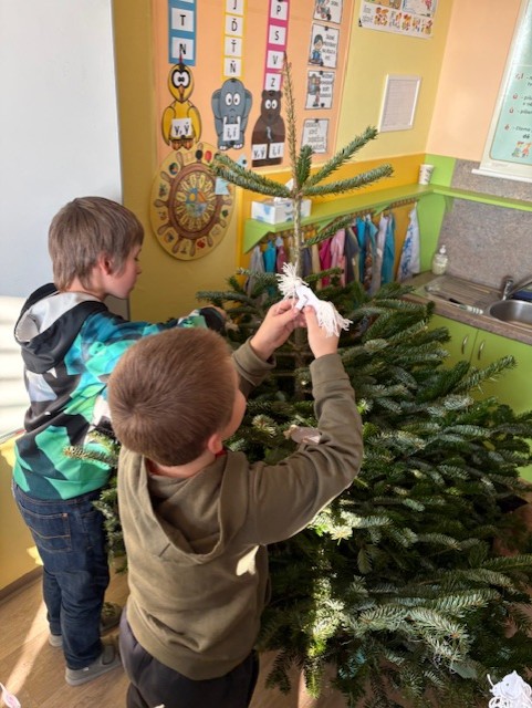 Zdobíme si třídu – lucerničky, stromečky, obrázky, stromeček. Každé ráno sedíme v kruhu u svíčky a ladíme se na na Vánoce všelikým povídáním o Vánocích. 🙂